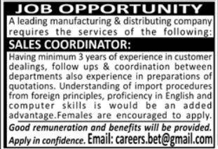Latest Manufacturing Company Sales Posts Karachi 2025