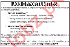 Vacancies in Manufacturing Concern Advertisement September 2019