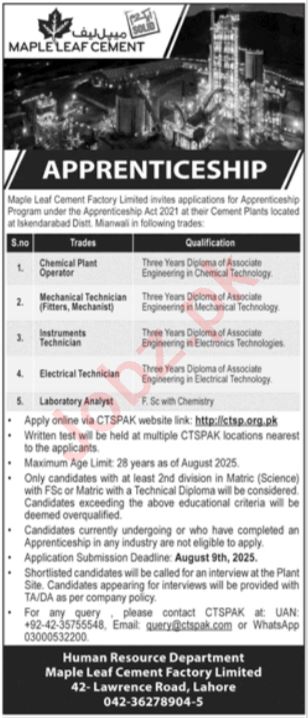 Maple Leaf Cement Apprenticeship 2025 Thorugh CTS Pak