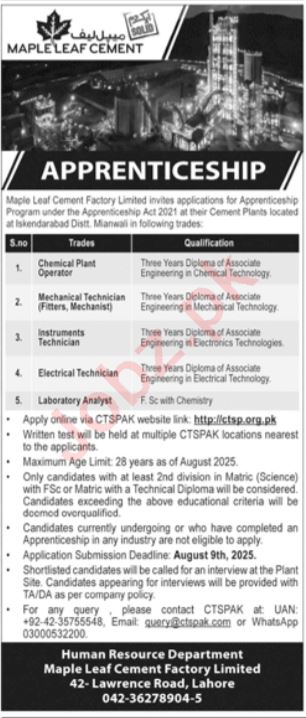 Maple Leaf Cement Apprenticeship 2025 via CTS Pak