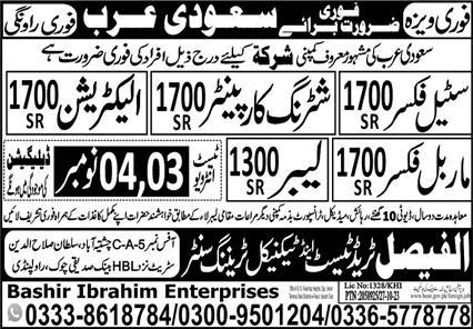 Latest Overseas jobs in Al Faisal Trade Test & Technical Training Center in Construction and others can be applied till 4 November 2023 or as per closing date in newspaper ad. Read complete ad online to know how to apply on latest Al Faisal Trade Test & Technical Training Center job opportunities. Skills in Electricians, Construction, Carpentry and General Labor may be preferred for these Al Faisal Trade Test & Technical Training Center jobs. Salary varies from 131000. Extra hours work allowed to earn more. Facilities like transport, accommodation and medical may be provided.