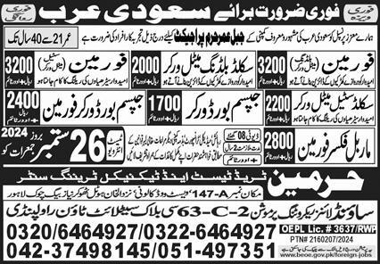 Sound Lines Recruiting Promotion jobs advertisement dated about 26 September 2024 in daily Express Newspaper invites application for the vacant post of foreman, building metal worker, marble fixer foreman, skilled building metal worker, gypsum board worker foreman, skilled steel metal worker, steel metal worker foreman and gypsum board worker in Madina, makkah Saudi Arabia. Candidates with Bachelor, Intermediate, DAE and Matric etc. educational background will be preferred.