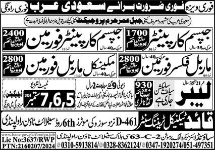 Quaid Technical Training Center jobs advertisement dated about 5 September 2024 in daily Express Newspaper invites application for the vacant post of gypsum carpenter, mechanical marble foreman, gypsum carpenter foreman, marble fixer foreman and labor in Madina, makkah Saudi Arabia. Persons with DAE, Bachelor, Matric and Intermediate etc. education can apply.