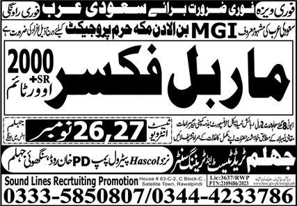 Jhelum Trade Test & Training Center jobs advertisement dated about 22 November 2023 in daily Express Newspaper invites application for the vacant post of marble fixer in Madina, makkah Saudi Arabia. Persons with Matric and Intermediate etc. education can apply.