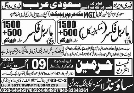 Apply at Harmain Trade Test & Technical Training Center latest Overseas jobs in Construction and departments before closing date which is around August 9, 2025 or as per closing date in newspaper ad. Read complete ad online to know how to apply on latest Harmain Trade Test & Technical Training Center job opportunities. Salary varies from 148000.