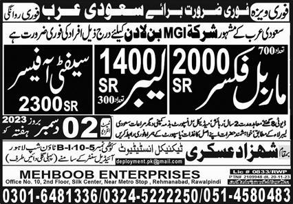 Latest Overseas jobs in Shahzad Askari Technical Institute in Construction and others can be applied till 2 December 2023 or as per closing date in newspaper ad. Read complete ad online to know how to apply on latest Shahzad Askari Technical Institute job opportunities. Learn today skills like Construction, Safety Consulting and General Labor to apply confidently on these Shahzad Askari Technical Institute jobs. Salary varies from 180000. Extra hours work allowed to earn more. Free accommodation, medical and transport may be available.