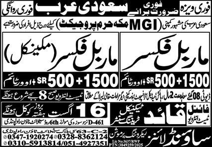 Quaid Technical Training Center jobs advertisement dated about 16 August 2025 in daily Express Newspaper invites application for the vacant post of marble fixer mechanical and marble fixer in Makkah, taif Saudi Arabia. Educational qualifications required Matric and Intermediate etc.