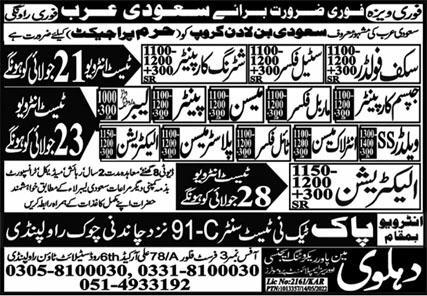 Pak Techni Test Center Makkah, jeddah Saudi Arabia invites applications from eligible candidates for the post of labor, plaster mason, welder, electrician, gypsum carpenter, scuff folder, tile fixer, steel fixer, marble fixer, painter, interlock mason, labor water proofing, shuttering carpenter and mason as per advertisement of July 20, 2022 published in daily Express Newspaper. Intermediate, Matric and Middle etc. educational qualification will be preferred.