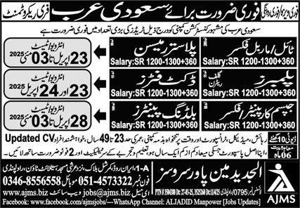 Vacant posts including tile fixer, marble fixer, gypsum carpenter, building painter, plaster mason, plumber, duct fitter and gypsum fixer are announced in Al Jadid ManPower Services Riyadh, dammam Saudi Arabia as per 23 April 2025 advertisement in daily Express Newspaper. Educational qualifications required DAE, Matric, Intermediate and Bachelor etc.