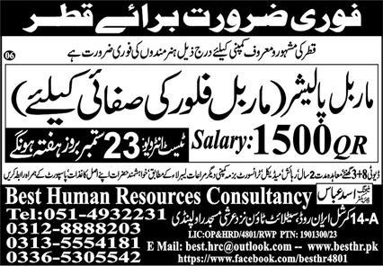 Vacant posts including marble polisher are announced in Best Human Resources Consultancy Qatar, qatar Qatar as per 21 September 2023 advertisement in daily Express Newspaper. Educational qualifications required Matric and Intermediate etc.