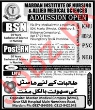 Mardan Institute of Nursing & Allied Medical Sciences is offering admissions for Bachelor of Science in Nursing BSN Degree Programs in Mardan Khyber Pakhtunkhwa KPK 2019. Read newspaper ad for exact details.