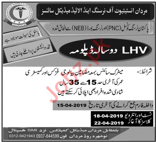Mardan Institute of Nursing & Allied Medical Sciences Has Admissions 2019 for the degree of LHV in Mardan, Test Interviews would be held on April 18th 2019. Classes will be started from April 22nd, 2019 Read newspaper ad for exact details.