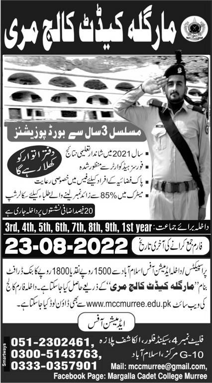 Margalla Cadet College class 3, class 4, class 5, Class 6, Class 7, Class 8, Class 9, Intermediate Part I, Fsc Pre Medical, Fsc Pre Engineering, ICS Computer Science admissions 2022 has been announced. Students can enroll for admissions in Margalla Cadet College Murree Punjab Pakistan for academic year 2022 to continue campus based or online education in Army College. Students who want to enroll for academic session 2022 in Middle, Primary, Matric and Intermediate qualification and admission criteria for Government institute can apply till last date 23 August 2022. Read newspaper ad for exact details.