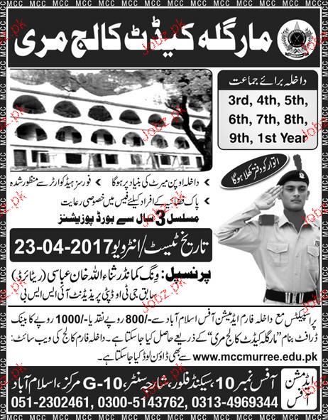 Margalla Cadet College Admission in Class III to XI in Murree. Read newspaper ad for exact details.