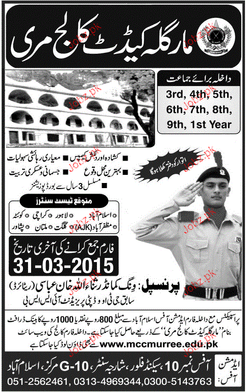 Margalla Cadet College Muree Admission in Class in III to XI in Murree. Read newspaper ad for exact details.