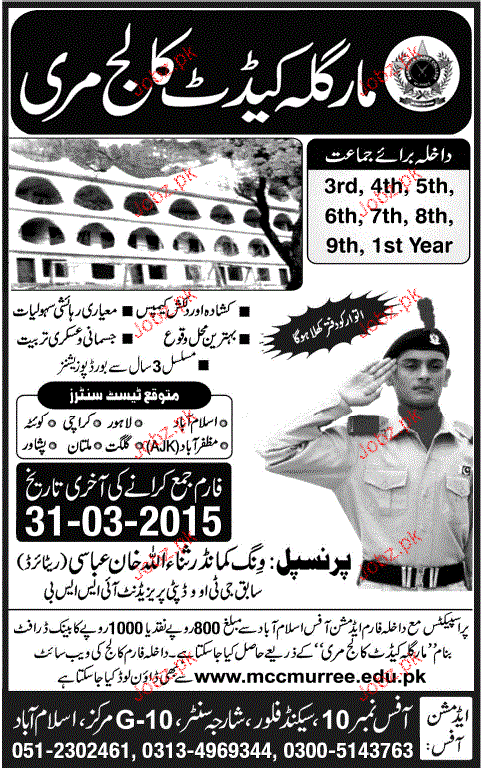 Margalla Cadet College Muree Admission in Class in III to XI in Islamabad. Read newspaper ad for exact details.