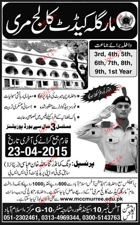 Margalla Cadet College Muree Admission in Class in III to XI in Murree. Read newspaper ad for exact details.