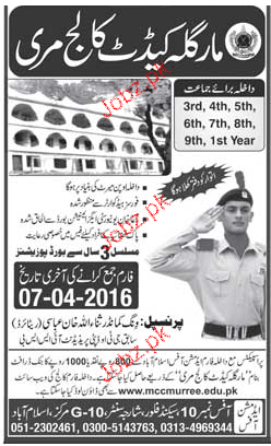 Margalla Cadet College Murree Admission in Class III toXI in Murree. Read newspaper ad for exact details.