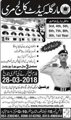 Margalla Cadet College Murree Admission in Class III to Class IX and Class XI in Murree. Last date for submission of admission forms is 28 March 2018. Admission Session 2018-2019. Read newspaper ad for exact details.