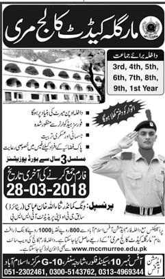Margalla Cadet College Murree Admission in Class III to XI in Murree. Last date for submission of admission forms is 28 March 2018. Admission Session 2018-2019. Read newspaper ad for exact details.