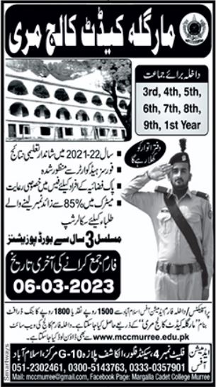 Margalla Cadet College class 3rd to 9th Class & Intermediate Part I, 11th class admissions 2023 has been announced. Margalla Cadet College Murree Punjab Pakistan welcomes students to apply for admissions in academic year 2023 in Science College. Students for admissions in Middle, Primary, Matric and Intermediate & criteria can apply as per Government institute admission policy 2023 before closing date March 6, 2023 as per advertisement. Read newspaper ad for exact details.