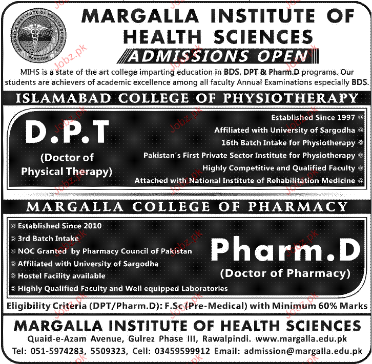 Margalla Institute of Health Science Admission in DPT and Pharm-D in Rawalpindi Read newspaper ad for exact details.