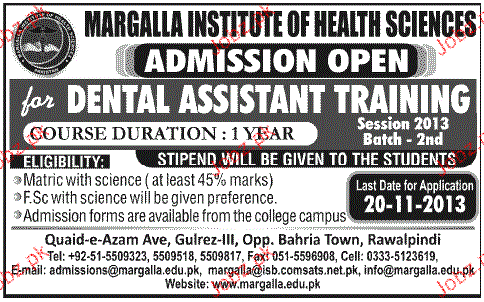 Margalla Institute of Health Sciences Admission in Margalla Institute of Health Sciences in Rawalpindi Read newspaper ad for exact details.