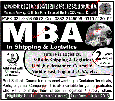 Maritime Training Institute Admission in MBA in Karachi. Read newspaper ad for exact details.