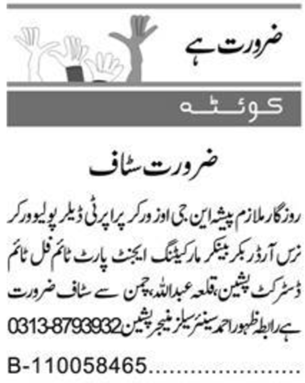 Private Company jobs advertisement dated about 28 November 2024 in daily Express Newspaper invites application for the vacant post of property dealer, order booker, ngo worker, marketing agent, nurse, banker and polio worker in Quetta, killa abdullah and pishin Balochistan Pakistan. Bachelor, BA, Matric, Intermediate and Middle etc. educational qualification will be preferred.