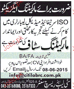 Marketing Executives are required in City Lab and Research Center in Lahore.