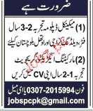 Marketing Executives and Mechanical Diploma Holders are required in Karachi. Qualified and Experienced Candidate Send their CV Along with All necessary Documents.