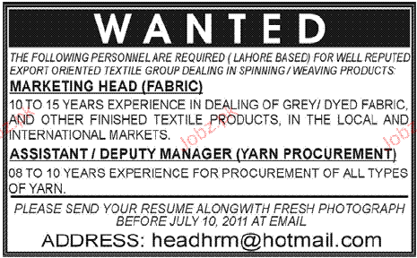 Marketing Head and Assistant / Deputy Manager Required