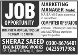 Latest Sheraz Saeed Engineering Works Management Posts Lahore 2025