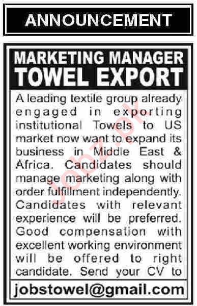 Latest Textile Group Marketing Posts Karachi 2025