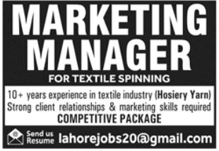Private Company Lahore, lahore Punjab Pakistan invites applications from eligible candidates for the post of marketing manager as per advertisement of August 10, 2025 published in daily Jang Newspaper. Persons with Bachelor and Master etc. education can apply.