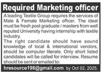 Textile Group latest Private Marketing jobs and others can be applied till 2 October 2025 or as per closing date in newspaper ad. Read complete ad online to know how to apply on latest Textile Group job opportunities.