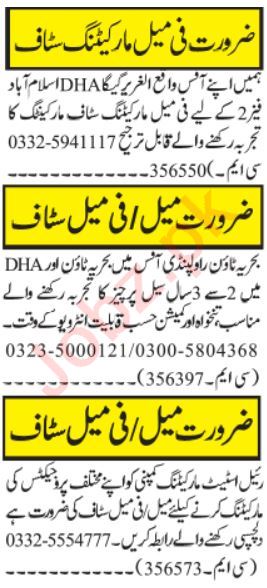 Marketing Company is looking for candidates for following posts as per job advertisement published in daily Jang Newspaper of July 22, 2022 for location Islamabad, rawalpindi Islamabad Pakistan: