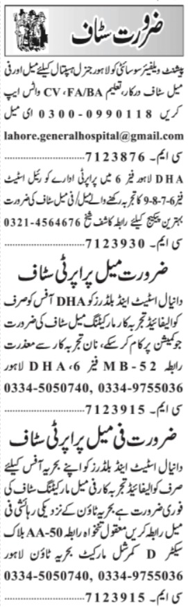 Vacant posts including marketing officer, marketing staff, paramedical staff, real estate marketing officer and commission agent are announced in Private Company Lahore, lahore Punjab Pakistan as per 8 October 2022 advertisement in daily Jang Newspaper. Candidates with Middle, Matric, Intermediate and Bachelor etc. educational background will be preferred.