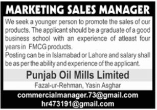 Vacant posts including Marketing Manager, Marketing Sales manager and Sales Manager are announced in Punjab Oil Mills Pvt Limited Islamabad, Lahore and Islamabad Pakistan as per 28 January 2022 advertisement in daily Jang Newspaper. Educational qualifications required Master and Bachelor etc.