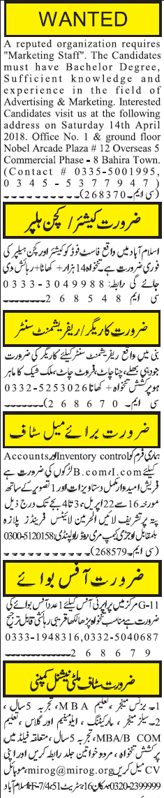 Marketing Staff, Cashiers, Kitchen helpers Job Opportunity