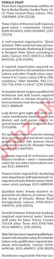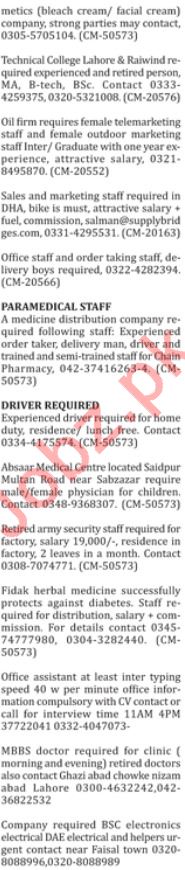 MBBS Medical Officer, Radiologist, Staff Nurse, LHV, Doctor, Lady Doctor, Technicians, Pharmacist, Midwives, Gynecologist, Receptionist, Dispenser, Male/ Female Executives, Salesman, Female Marketing Staff, Sales Staff, Computer Operator, Sales Manager and Sales Officer required in well reputed companies.