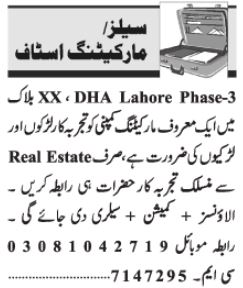 Marketing Company is looking for candidates for following posts as per job advertisement published in daily Jang Newspaper of June 25, 2024 for location Lahore, lahore Punjab Pakistan:
