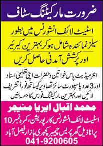 State Life Insurance Corporation of Pakistan Faisalabad Punjab Pakistan invites applications from eligible candidates for the post of Sales Representative, Sales Officer and Marketing Officer as per advertisement of February 13, 2022 published in daily Express Newspaper. Candidates with Intermediate and Bachelor etc. educational background will be preferred.