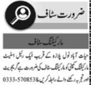 Vacant posts including marketing staff and marketing officer are announced in Real Estate Company Peshawar, peshawar Khyber Pakhtunkhwa KPK Pakistan as per 27 May 2022 advertisement in daily Mashriq Newspaper. Bachelor, Intermediate and Matric etc. educational qualification will be preferred.