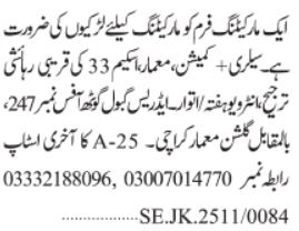 Marketing Company jobs advertisement dated about 7 November 2025 in daily Jang Newspaper invites application for the vacant post of marketing officer and marketing staff in Gulshan-e-Maymar Karachi, karachi Sindh Pakistan. Preferred Education is Intermediate and Bachelor etc.