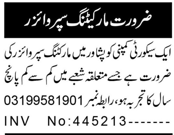 Vacant posts including marketing supervisor are announced in Security Company Peshawar, peshawar Khyber Pakhtunkhwa KPK Pakistan as per 20 September 2025 advertisement in daily Aaj Newspaper. Preferred Education is Intermediate and Bachelor etc.