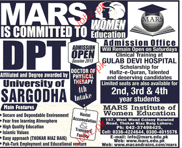 Mars Women Education System Admission in DPT in Lahore. Read newspaper ad for exact details.