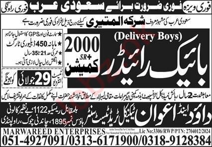 Marwareed Enterprises Riyadh, riyadh Saudi Arabia invites applications from eligible candidates for the post of bike rider as per advertisement of July 29, 2024 published in daily Express Newspaper. Candidates with Middle, Primary and Matric etc. educational background will be preferred.
