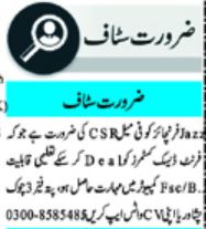 Jazz Franchise invites applications for job positions advertised in daily Mashriq dated 20 May 2024 for following vacancies in Peshawar, peshawar Khyber Pakhtunkhwa KPK Pakistan.