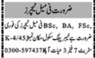 Vacant posts including female teacher and teacher are announced in Khyber Public School and College Peshawar, peshawar Khyber Pakhtunkhwa KPK Pakistan as per 23 September 2024 advertisement in daily Mashriq Newspaper. Educational qualifications required BA, Intermediate and Bachelor etc.